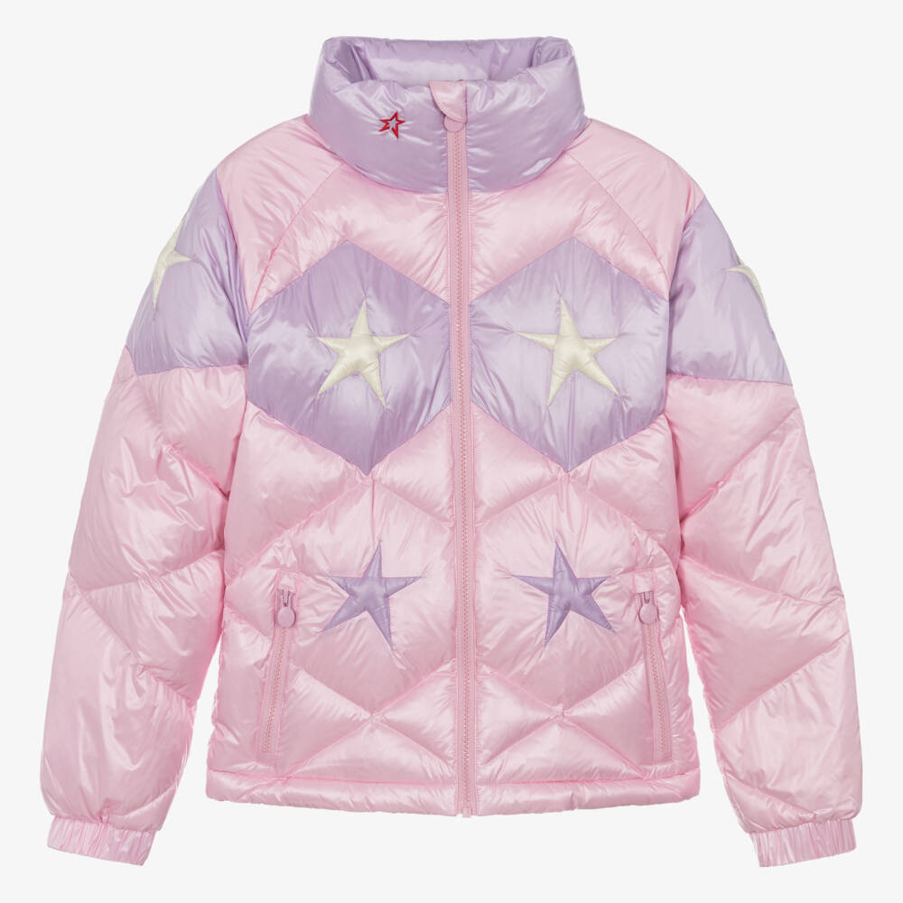 A pink technical ski jacket for teen girls by luxury brand Perfect Moment, made in silky smooth, quilted fabric with a lightweight feel. Stylish for the slopes, this down padded jacket is patterned in the designer's signature lilac purple stars, with a red embroidered star on the neck. It has a full zip front, elasticated cuffs and adjustable toggles on the hem to ensure a snug fit. There are practical zip-up pockets on the front and an additional pocket inside for storing ski passes safely. The inside lining has a fun polar bear print and helps to ensure maximum warmth and cosiness in wet, snowy conditions.