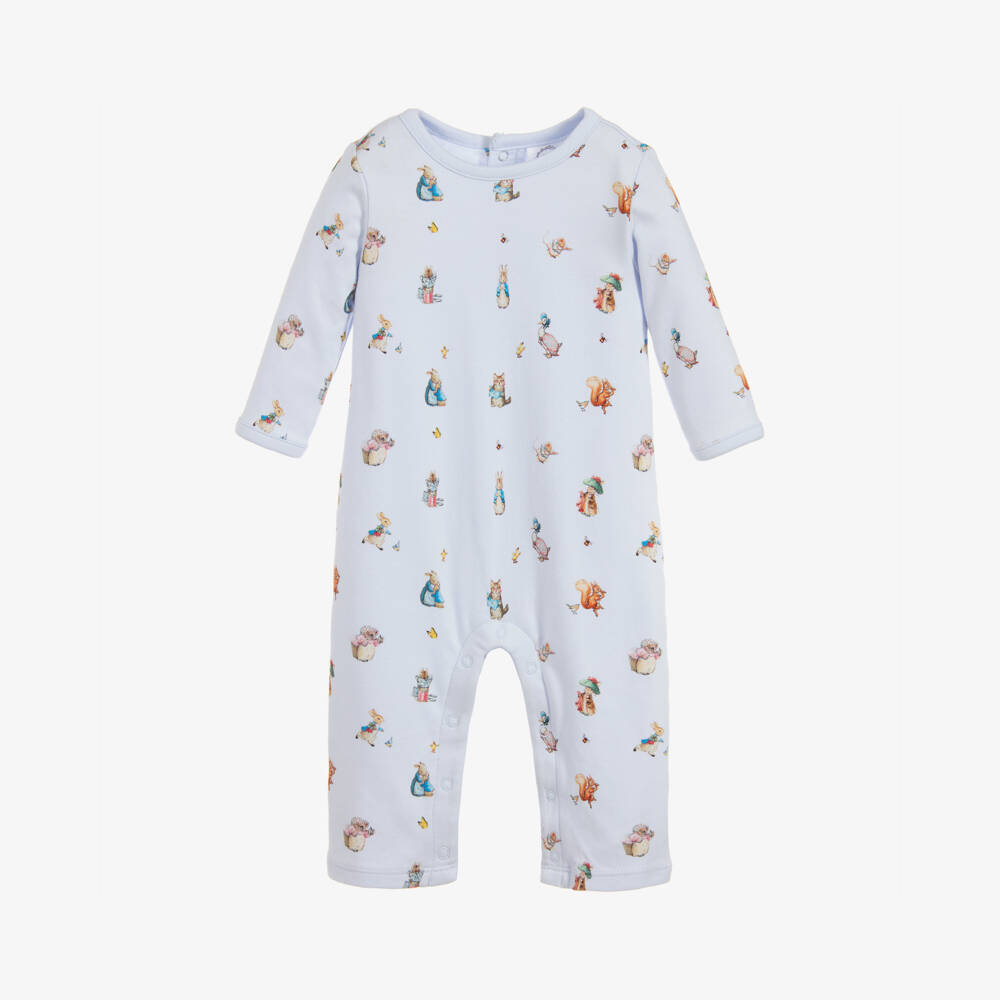 Pale blue cotton Peter Rabbit™ by Childrensalon romper for baby boys and girls. Made in super soft and comfortable jersey, it has a delightful print from the original illustrations by Beatrix Potter. There are easy-to-use popper fastenings on the back and between the legs for speedy dressing.