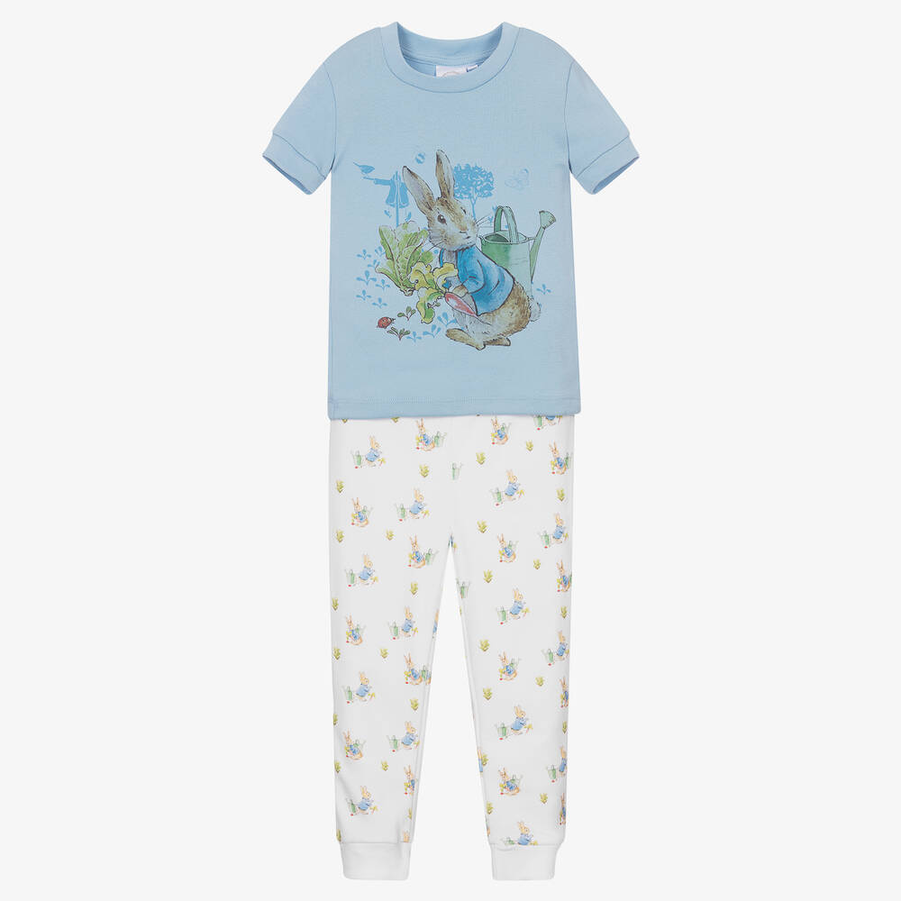 Blue and white cotton pyjamas for boys and girls from Peter Rabbit™ by Childrensalon, made in comfortable jersey. The top has an adorable original Peter Rabbit illustration by Beatrix Potter, in shades of blue, red, and green. The white bottoms have an all-over coordinating print, with cosy ribbed cuffs.