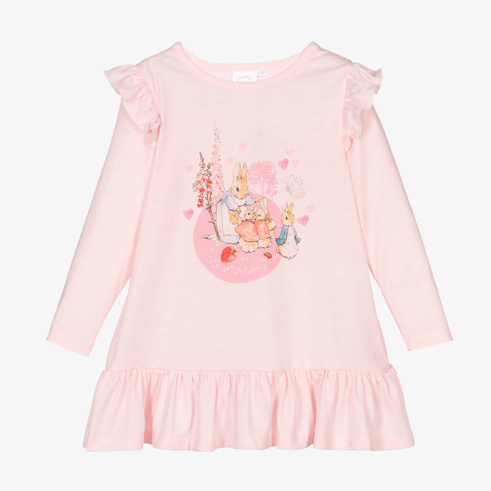 Pink nightdress for girls from Peter Rabbit™ by Childrensalon, made in super soft, comfortable jersey. On the front is an adorable original Peter Rabbit illustration by Beatrix Potter, with hearts and flowers in pink and blue. The nightdress has an embroidered pink picot trim around the neckline, pretty frills over the shoulders and a frilled hemline.