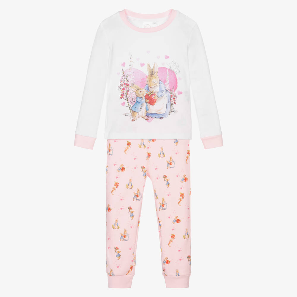 White and pink pyjamas for girls from Peter Rabbit™ by Childrensalon, made in super soft cotton jersey with pink ribbed trims. The white top has an adorable original Peter Rabbit illustration by Beatrix Potter, with hearts and flowers in pink and blue. The pink bottoms have a coordinating print.