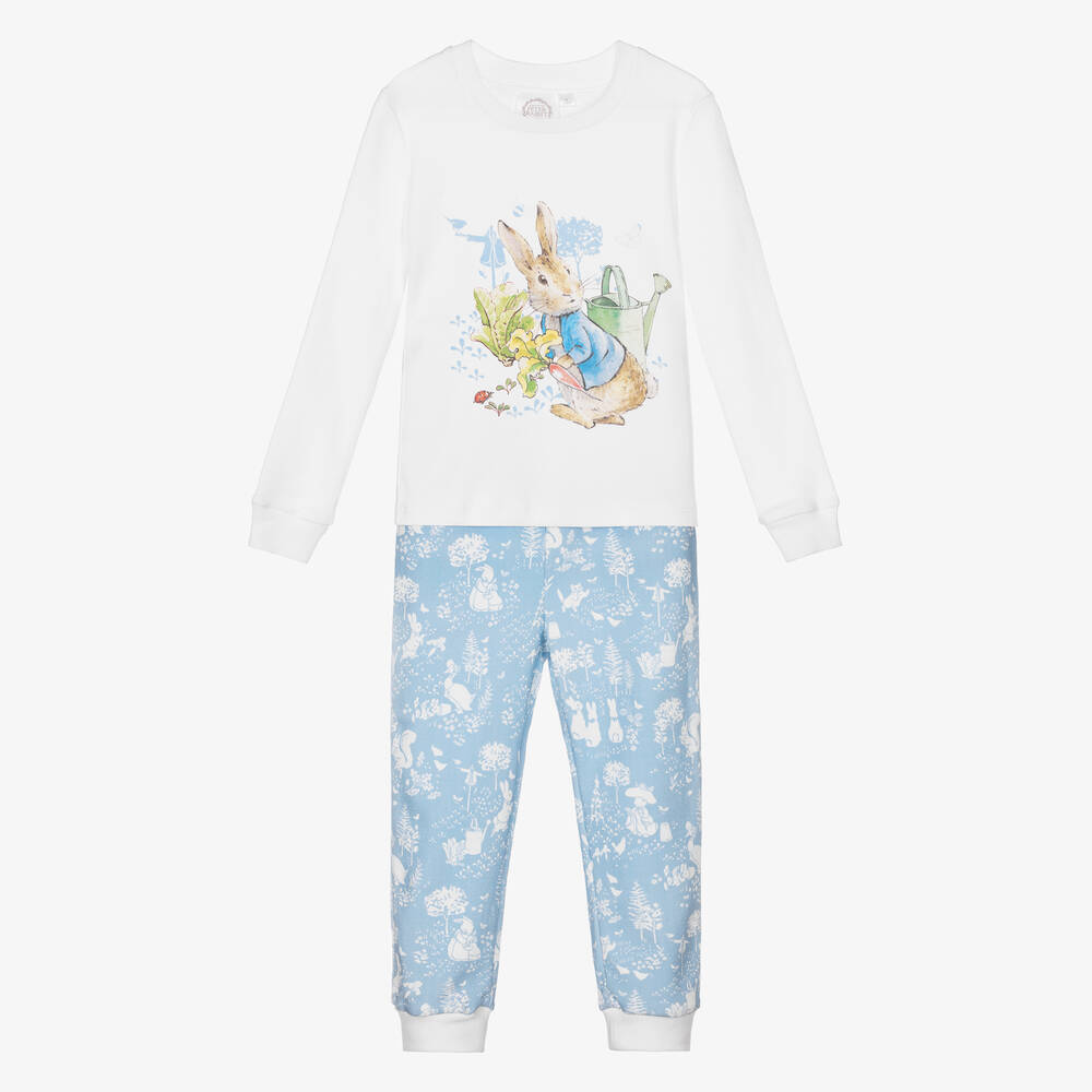Enchanting Peter Rabbit™ by Childrensalon cotton pyjamas for boys and girls, made in comfortable white and pale blue jersey. The top has a Peter Rabbit print on the front, and the trousers are printed with a medley of characters from the original illustrations by Beatrix Potter, including Jemima Puddle-Duck.
