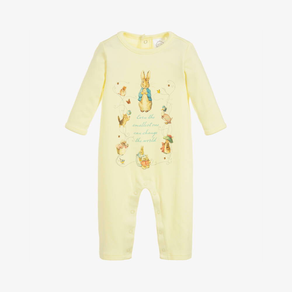 Pale yellow Peter Rabbit™ by Childrensalon cotton romper for baby boys and girls. Made in super soft, comfortable jersey, it has a delightful print from the original illustrations by Beatrix Potter. There are easy-to-use poppers on the back and between the legs for speedy dressing.