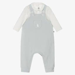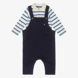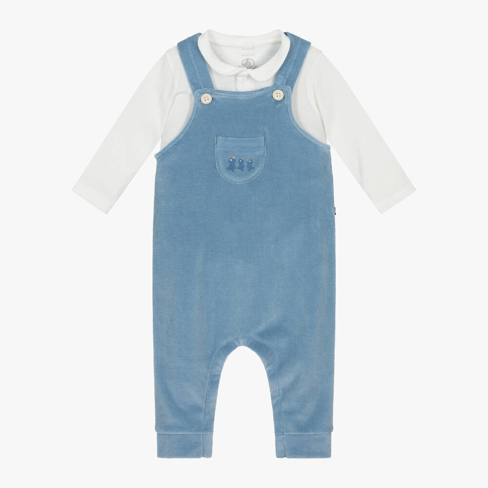 Adorable ivory and blue dungarees set for baby boys by Petit Bateau. Made in soft organic cotton jersey, the simple white bodyvest has a classic rounded collar and useful popper fastenings on the front and between the legs. The blue velour dungarees have a sweet duckling embroidery on the chest and cross-over straps. The adjustable straps fasten with buttons for a comfortable fit and there are poppers between the legs to help with changing.