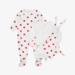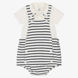 A charming yellow babysuit set for boys and girls by Petit Bateau, made in soft cotton. Lovely for the warmer months, the set comprises a striped shortie, with easy-to-use popper fastenings on the front and a useful muslin, ideal for mopping up little spills. It comes with a branded storage bag, making it a delightful gift for a new arrival.