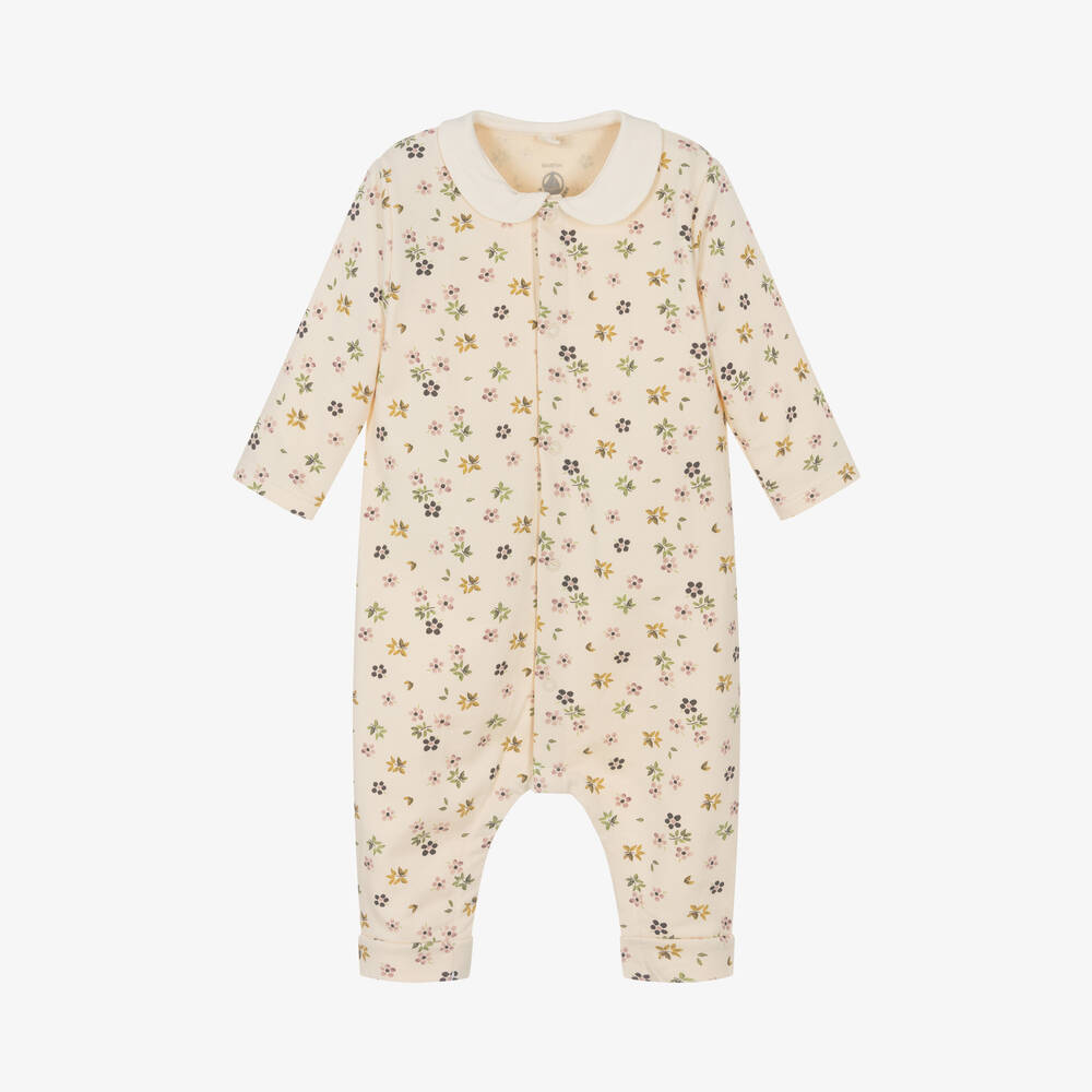 Sweet ivory romper for baby girls by Petit Bateau, made in soft organic cotton jersey. Patterned with ditsy florals, this cute one piece has a classic rounded collar and easy-to-use popper fastenings on the front and between the legs.