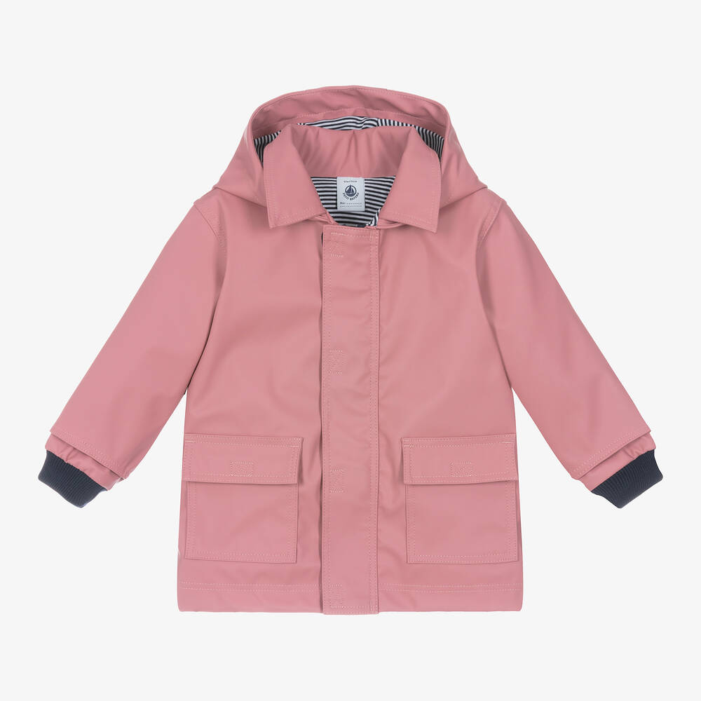 A pink hooded raincoat for baby girls by Petit Bateau, made in smooth, water-repellent material. Comfortably lined with navy blue and white Milleraise striped cotton jersey, this practical design has a large protective hood and stretchy ribbed cuffs. There are flap pockets on the front and it fastens with a zip, concealed beneath a velcro placket. This item is made with at least 40% recycled material.