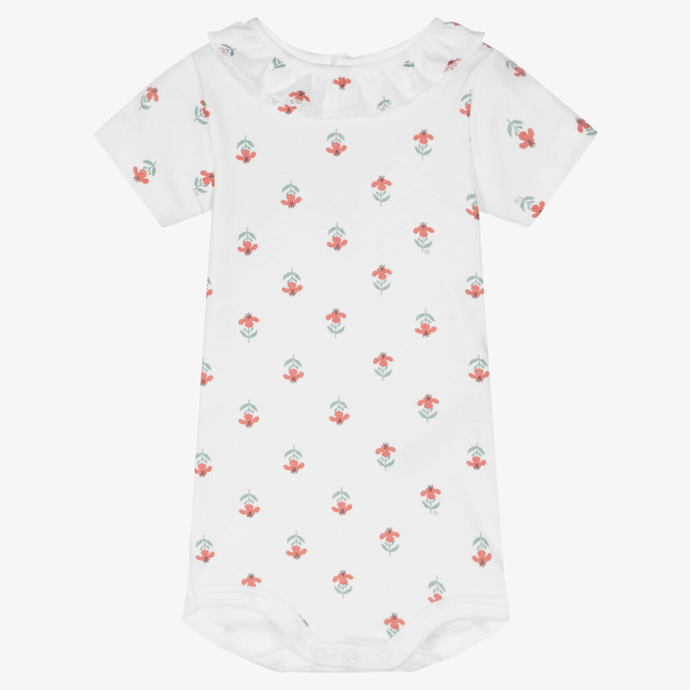 Off-white bodysuit for baby girls by Petit Bateau, patterned in a pretty floral print in green and red. It has a feminine ruffle collar, trimmed in delicate picot embroidery. Made in soft and comfortable organic cotton jersey, it fastens easily with poppers on the back and between the legs.