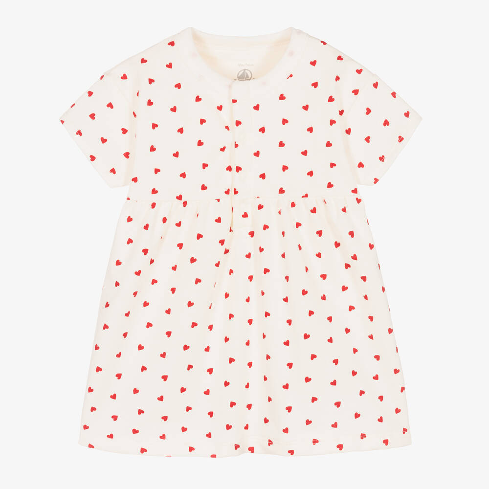 Adorable white dress for baby girls by Petit Bateau, made in soft organic cotton jersey. It is patterned with a sweet red heart print all over and has a conveniently attached bodysuit inside. Easy-to-use poppers on the front and between the legs make dressing and changes fuss-free.