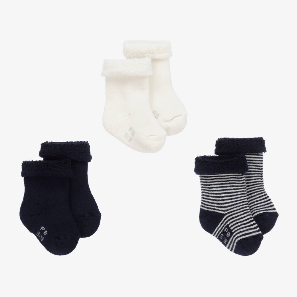 Pack of three pairs of navy blue and ivory socks for baby boys and girls by Petit Bateau. They are made in stretchy cotton and lined in soft and plush towelling. One pair is striped and the other two are plain.