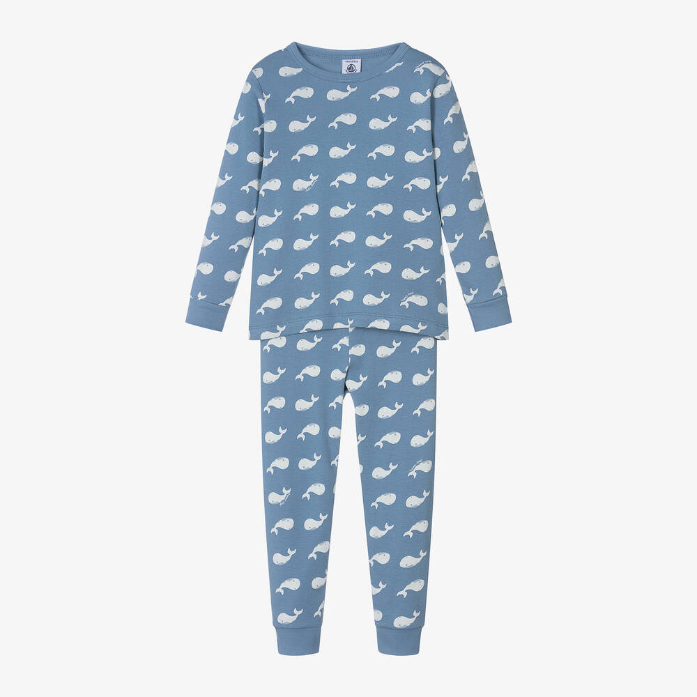 Blue jersey pyjamas for boys by French brand Petit Bateau, made from soft and delicate organic cotton. Classic for lounging in before bedtime, they have a sweet ivory whale print with a logo subtly signed throughout. The long-sleeved top has fitted cuffs and the trousers have a comfortably elasticated waist.