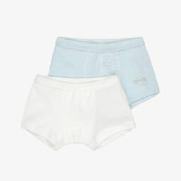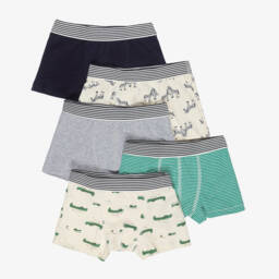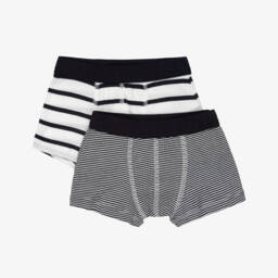Three pairs of boxer shorts for boys by Petit Bateau, in ivory, navy blue and grey. Designed for comfort, they are made in soft and stretchy cotton jersey with wide waistbands in the brand's Milleraies stripes. Two pairs are plain and one pair is striped and patterned with colourful Eiffel Tower prints.