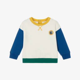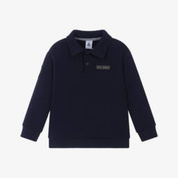 Green cotton sweatshirt for boys by Petit Bateau, made in soft, mid-weight jersey with a warm, fleecy inside. Casual and cosy, it has a stand-up collar with a half zip fastening and a useful pouch pocket on the front. There is a circular blue logo patch on the chest for brand appeal and sporty stripes on the ribbed cuffs in shades of blue and ivory.