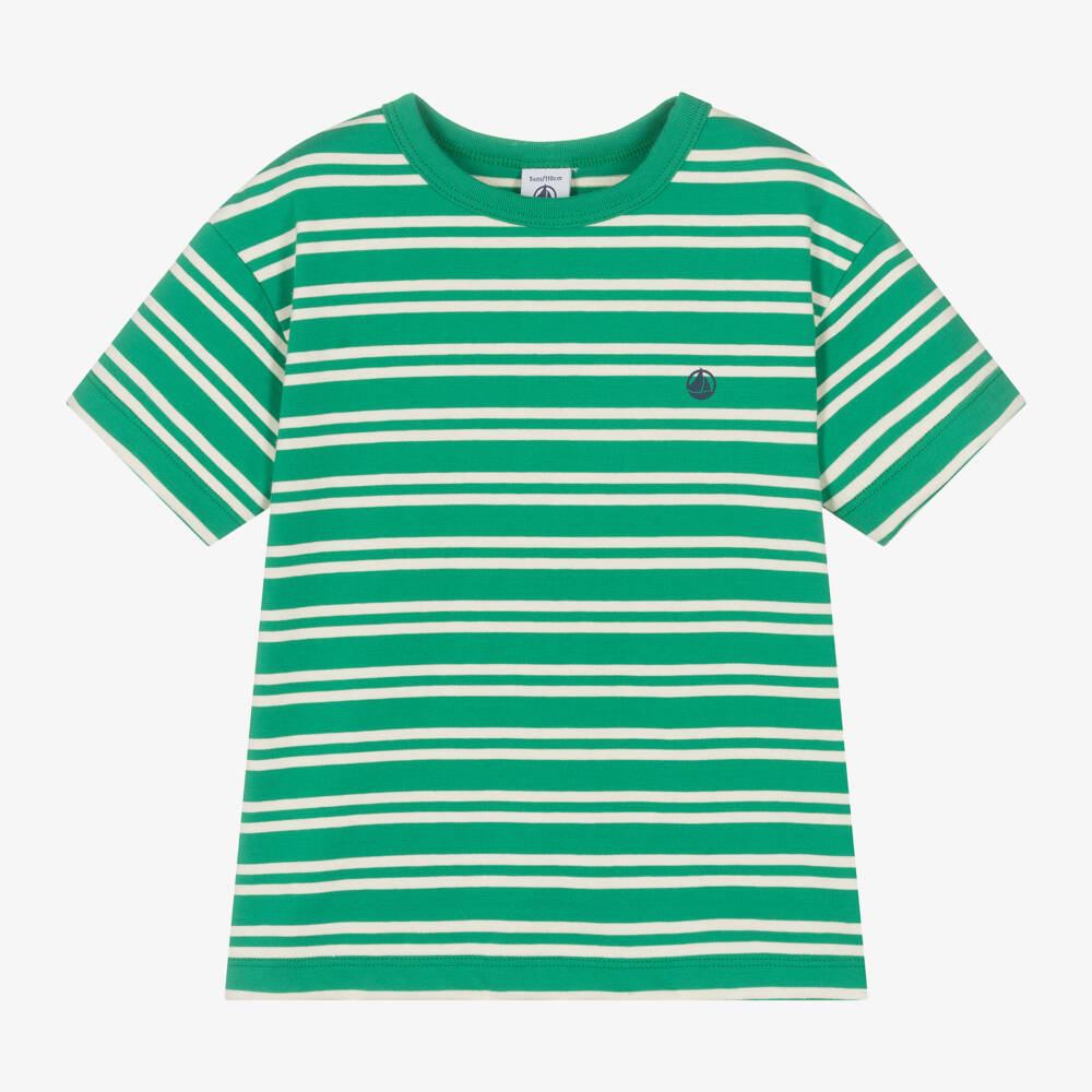 A striped T-shirt for boys from Petit Bateau, in complementary green and ivory. With a subtle blue boat logo print on the chest, this short-sleeved T-shirt offers lasting comfort thanks to its organic cotton fabric.