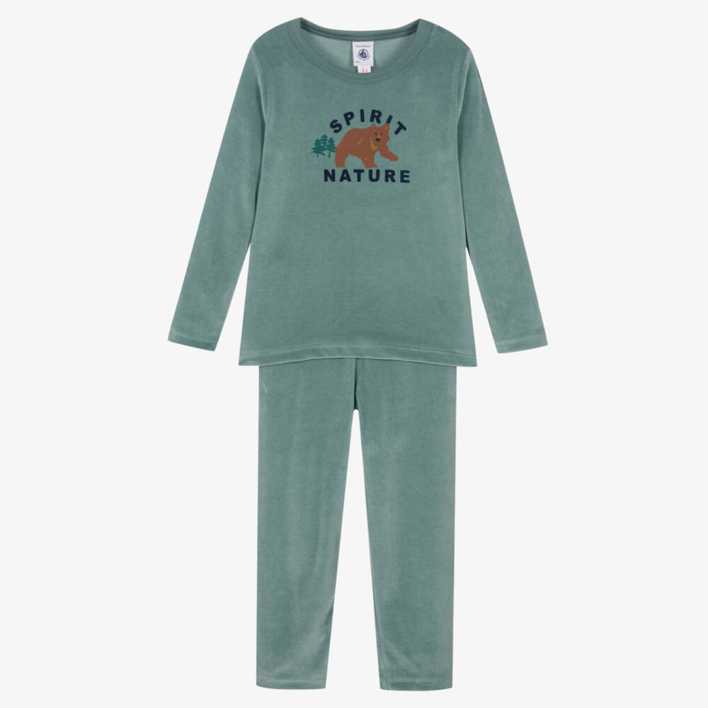 Green long pyjamas for boys by Petit Bateau, made in soft and cosy velour from organic cotton. Super comfortable to wear, the trousers have a gently elasticated waist, and there is a fun 'Spirit Nature' motif on the front.