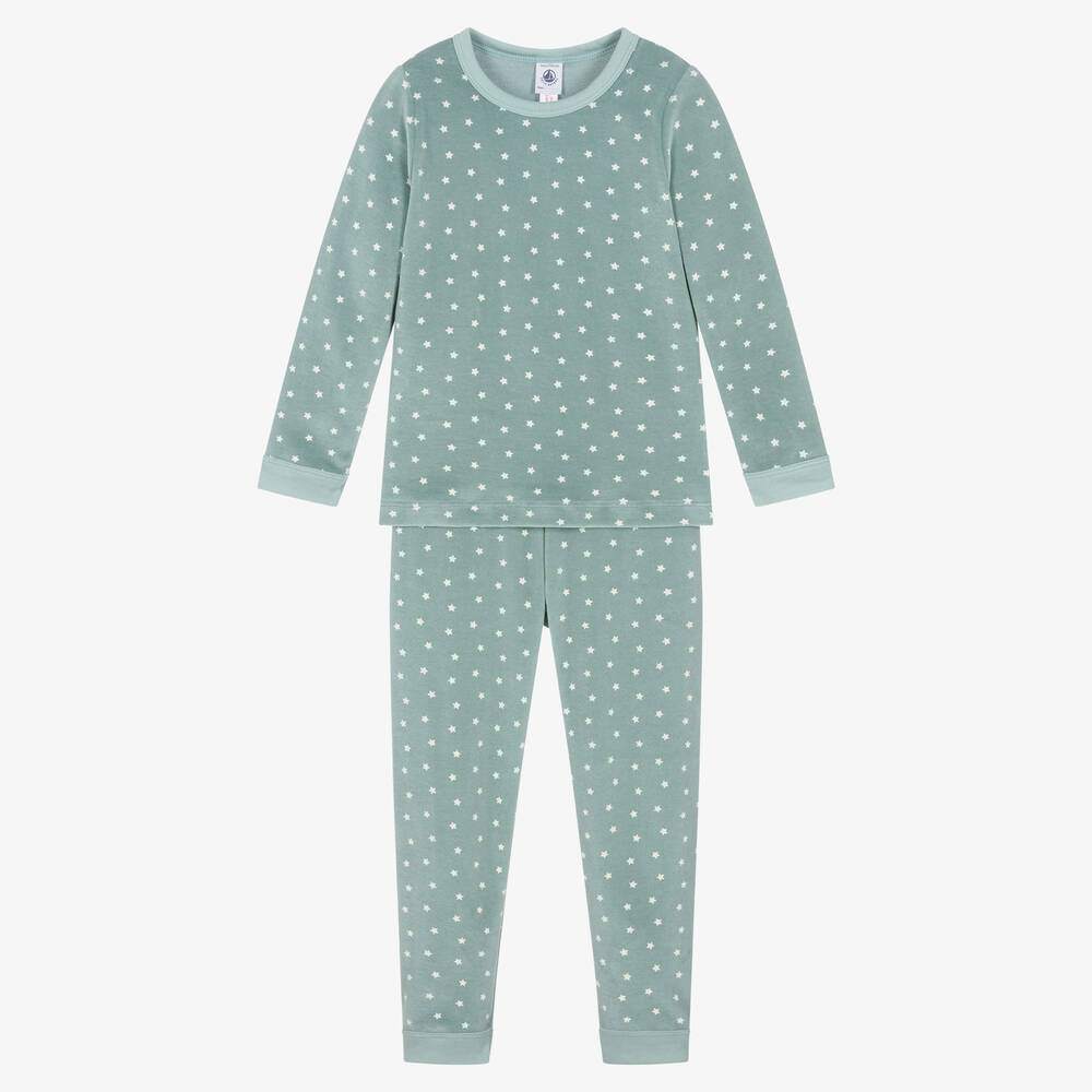 Green long pyjamas for boys by Petit Bateau, with an all-over white star print. Cosy and comfortable to wear, they are made in soft velour from organic cotton. They have ribbed jersey trims and the trousers have a gently elasticated waist.