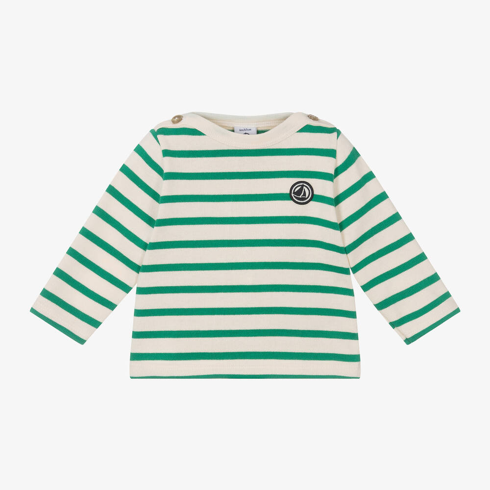 An ivory organic cotton top for little boys by French brand Petit Bateau, with a bold green stripe design. Made in soft jersey, it has a logo patch stitched on the chest for designer appeal. Styled with long sleeves, it has button fastenings on both shoulders to help with dressing.
