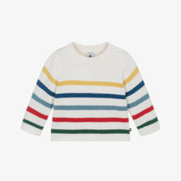 An adorable ivory sweater for little boys from Petit Bateau, knitted in soft cotton. Bright red stripes across the body and arms give a timelessly stylish finish and compliment the nautical theme logo badge on the chest. Button fastenings can expand the neck for fuss-free dressing.