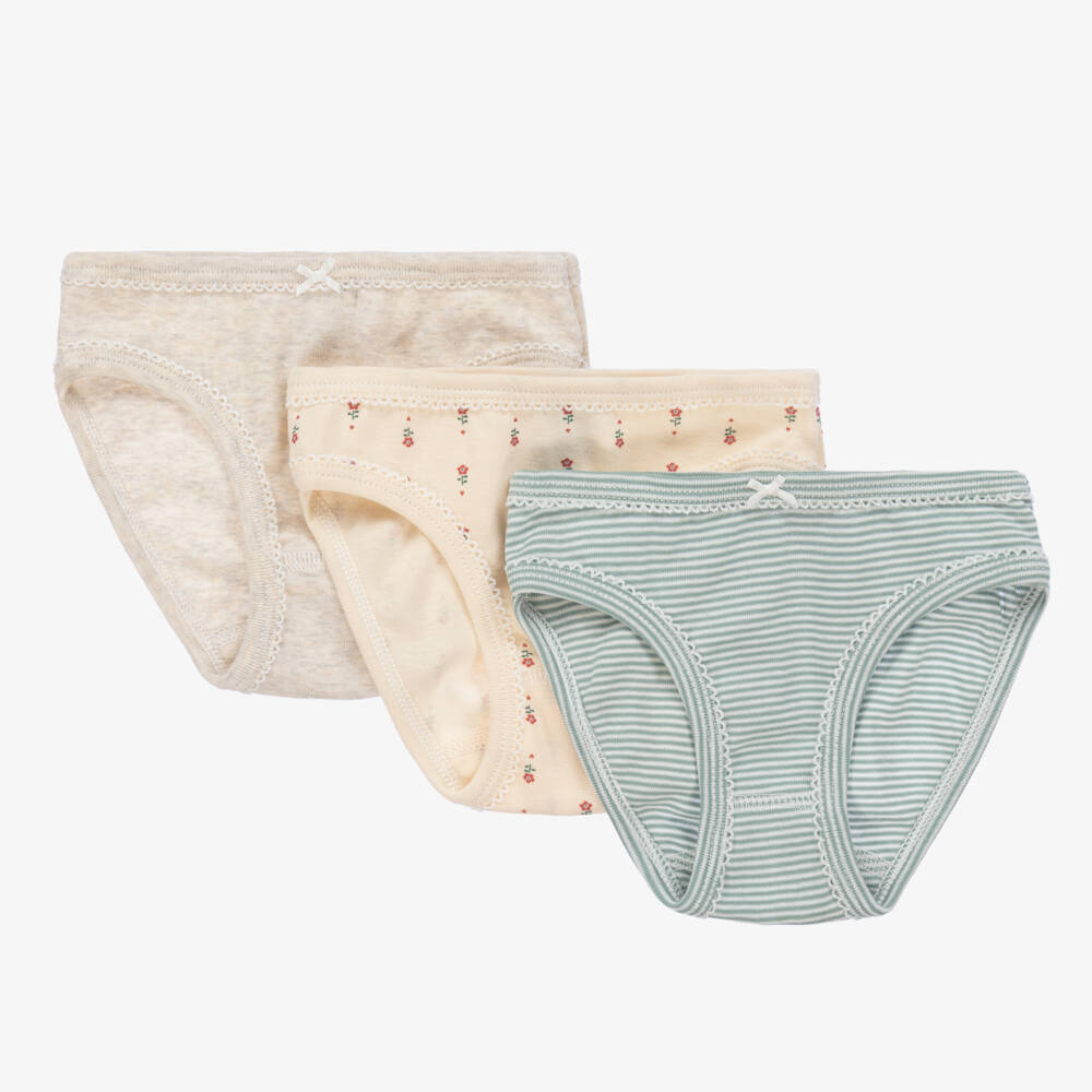 Pack of three organic cotton knickers for girls by Petit Bateau, in lovely shades of beige and green. Made in soft and super comfortable jersey, they have delicate picot trims and two pairs are finished with a sweet satin bow on the front. One is in beige marl, one pair has a red flower pattern and the other one has green and white stripes.