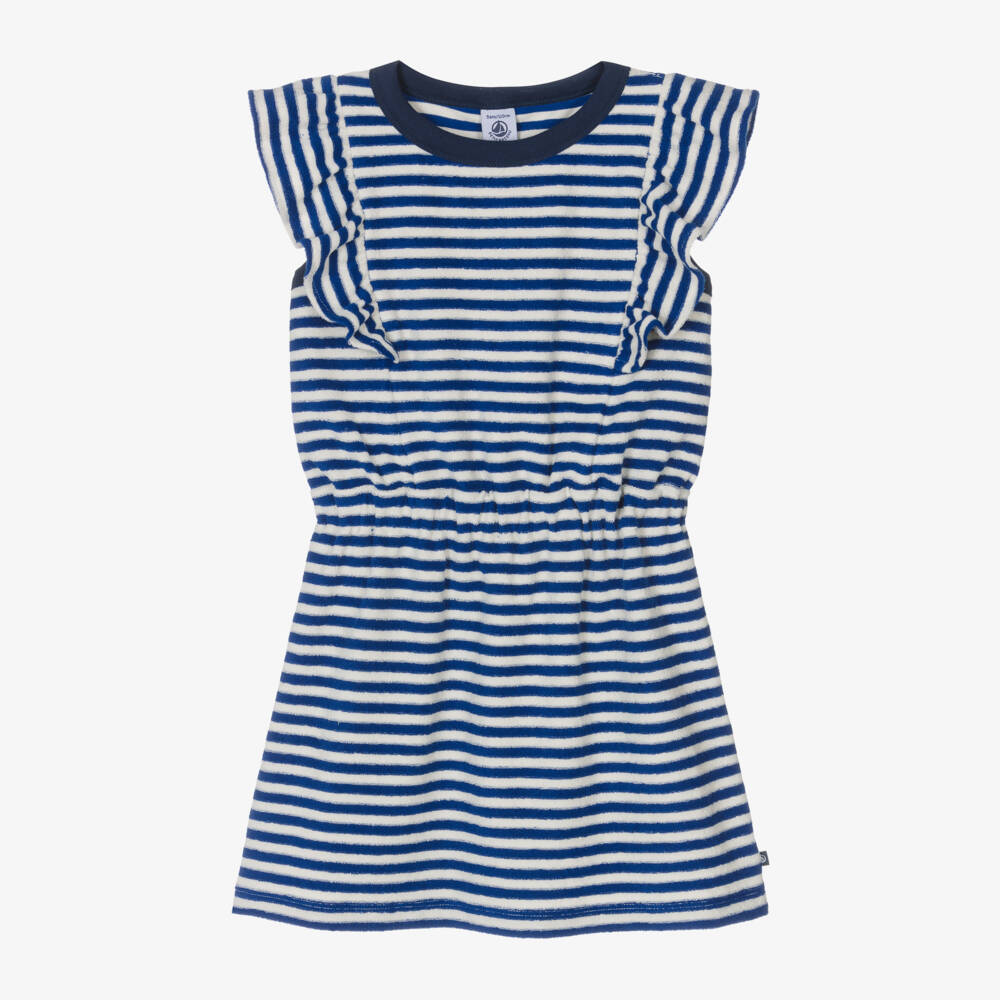 Girls blue striped dress by French brand, Petit Bateau. Made in soft organic cotton towelling, this casual style has a Breton-striped design, flutter sleeves and an elasticated waist.