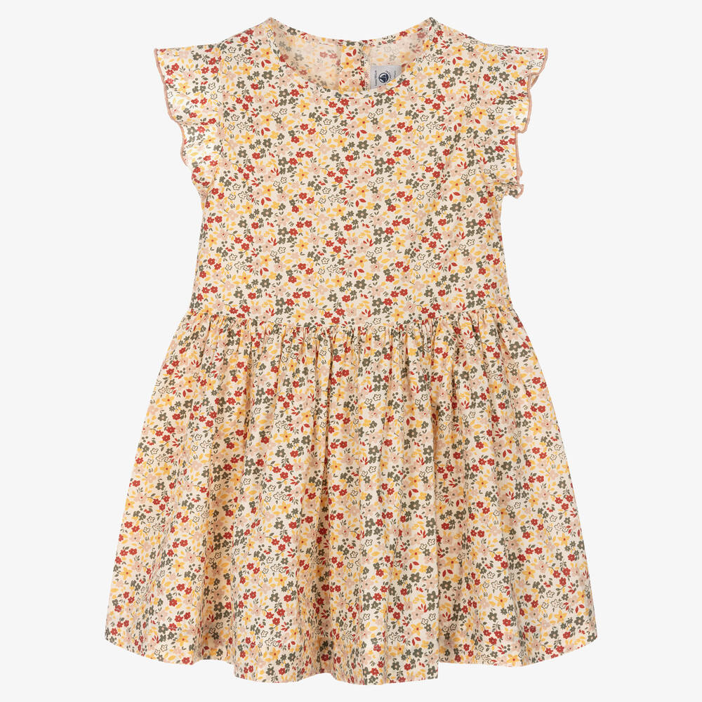 Ivory with a pretty red, yellow and green floral print, this lovely dress for girls is by Petit Bateau. Woven in soft lightweight cotton, it has pretty flutter sleeves and a gently gathered skirt. It fastens neatly with a concealed zip on the back.