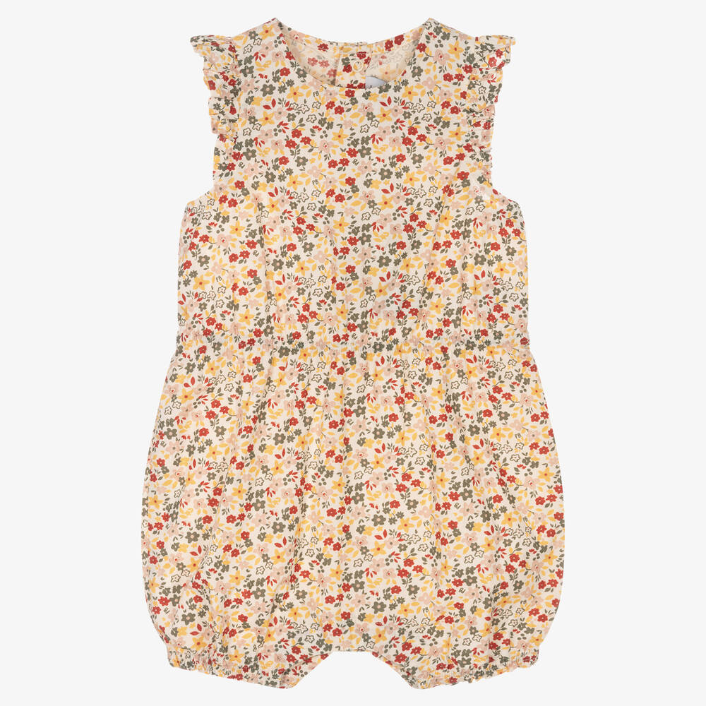 Ivory with a pretty red, yellow and green floral print, this lovely shortie for baby girls is by Petit Bateau. Woven in soft lightweight cotton, it has pretty ruffled sleeves and a gently elasticated waist. There are easy-fastening poppers on the back and between the elasticated legs.