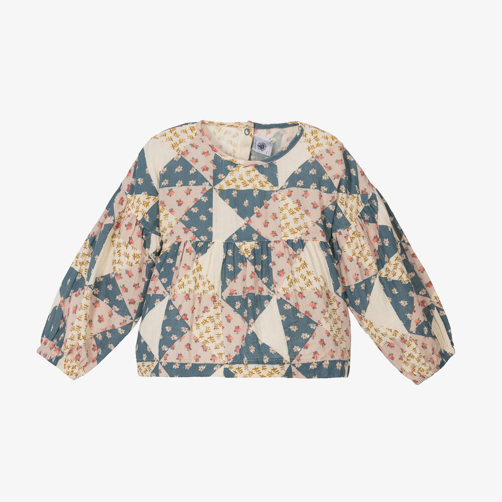 Lovely ivory blouse for girls by French brand Petit Bateau, made in lightweight organic cotton. This pretty loose-fitting top is patterned with a delightful floral patchwork print in blue, ivory and pink. Designed with dropped shoulders, it has elasticated cuffs and pretty puffed sleeves, with popper fastenings on the back giving a neat finish.