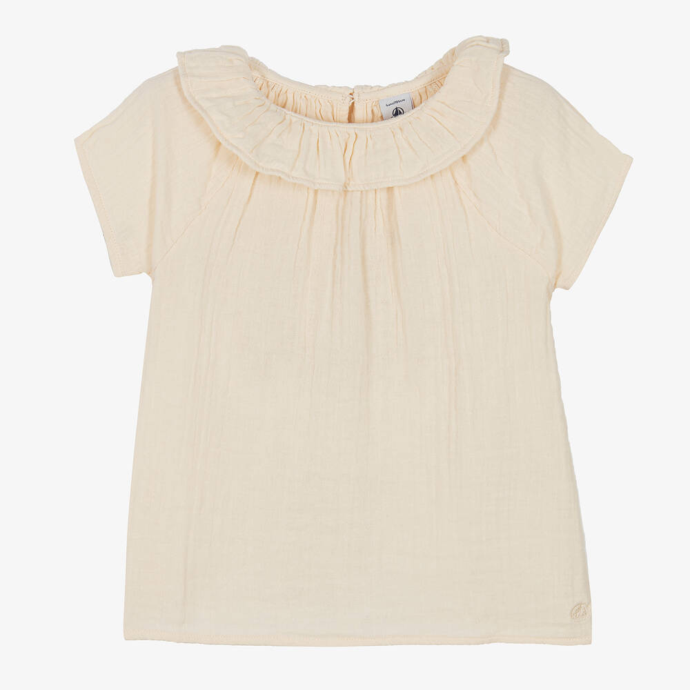 Lovely ivory blouse for girls by French brand Petit Bateau, made in organic cotton seersucker. Super soft and with a relaxed fit, it is comfortable and a delicate ruffle collar gives a feminine finish. It has a key-hole detail on the back which fastens securely with a single button.