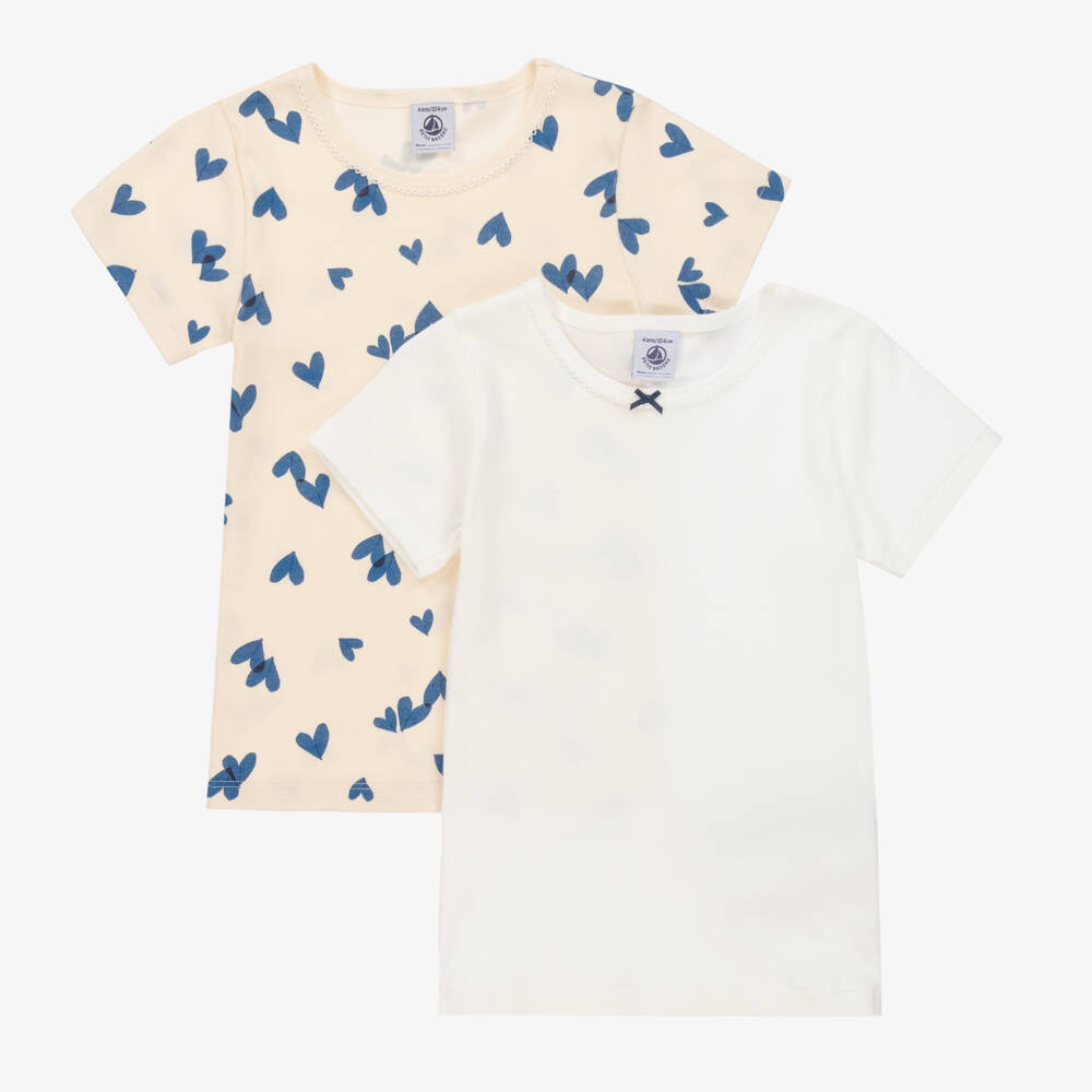 Pack of two underwear T-shirts for girls from Petit Bateau, in contrasting ivory shades. Made in soft and comfortable organic cotton jersey with embroidered picot trim on the crew neck, one is patterned with blue hearts and the other has a navy blue satin bow detail.