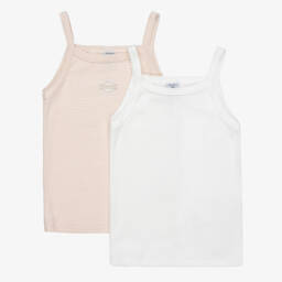 A three-pack of vest tops for girls by Petit Bateau, in shades of green, ivory and white. Made from super soft cotton jersey, these sleeveless tops are ideal as a base layer or paired with their pyjama bottoms. They have sweet love heart patterns and scalloped stitching, with a satin bow detailing the plain style.