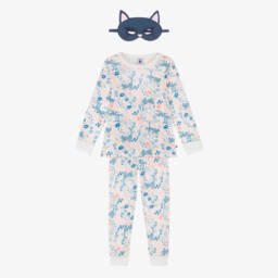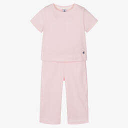 Pretty pink pyjamas for girls by Petit Bateau, made in beautifully soft cotton jersey. These comfortable pyjamas are snug fitting with ribbed cuffs and are printed with a logo of hearts with the brand name for a designer finish.