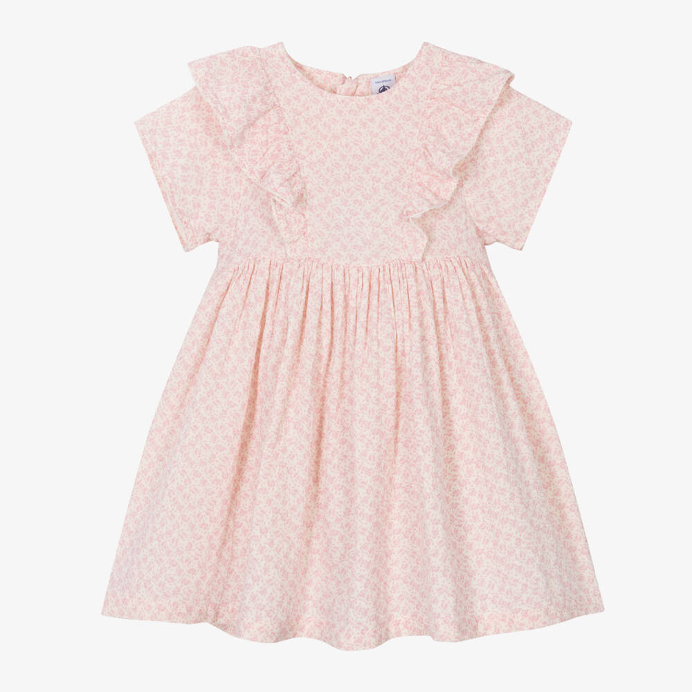 An ivory dress for girls by French brand Petit Bateau, with a charming pink floral design. Woven in beautifully soft organic cotton, this loose-fitting style has a full, gathered skirt and short sleeves. The bodice is lined for comfort and features a decorative ruffle with a delicate embroidered trim adding a feminine finishing touch. The dress is fastened neatly on the back with a concealed zip.