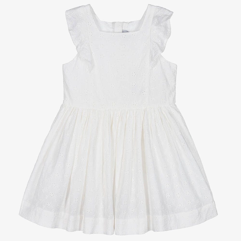 Elegant white dress for girls by French brand Petit Bateau, made in lightweight cotton. With stunning broderie anglaise detailing and tonal embroidery, this lovely dress is feminine and timelessly stylish. Ideal for warmer days, it is sleeveless and has a lightly gathered waist creating a flared skirt which moves freely. A concealed zip fastening on the back makes dressing easier with a neat finish.