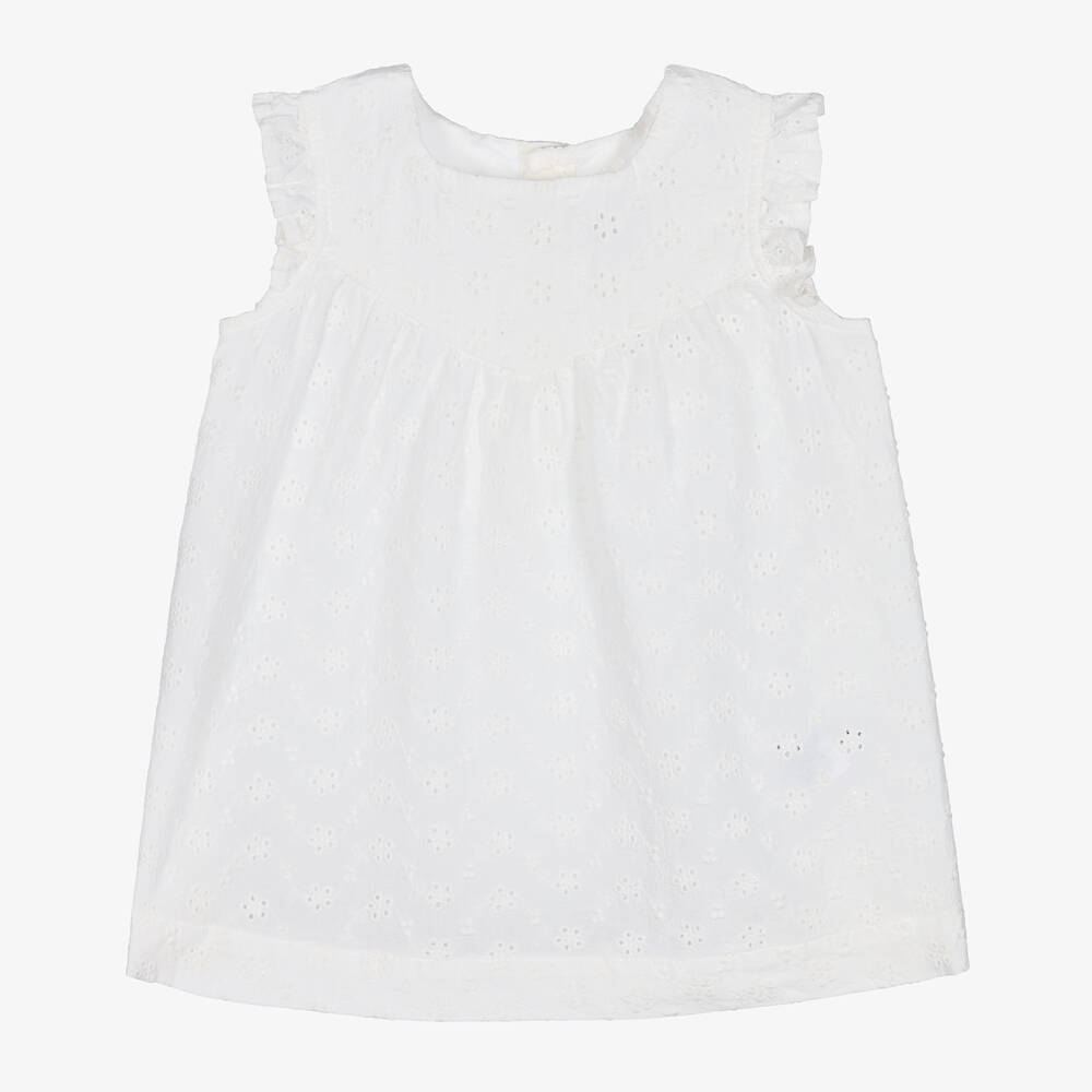 Sweet white dress for little girls by French brand Petit Bateau, made in lightweight cotton. This lovely dress is patterned with broderie anglaise detailing and tonal embroidery, with button fastenings on the back for a traditional look. It comes with matching knickers for a coordinated look.