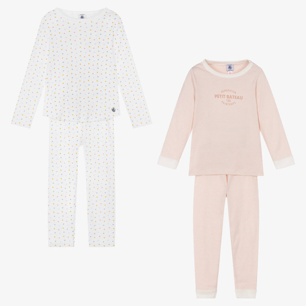 Pack of two pyjamas for girls by Petit Bateau, made in soft and comfortable cotton jersey. One pair has pink and ivory stripes, with a logo print on the front. The other pair is white and patterned with pretty hearts in print in pink, yellow and blue.