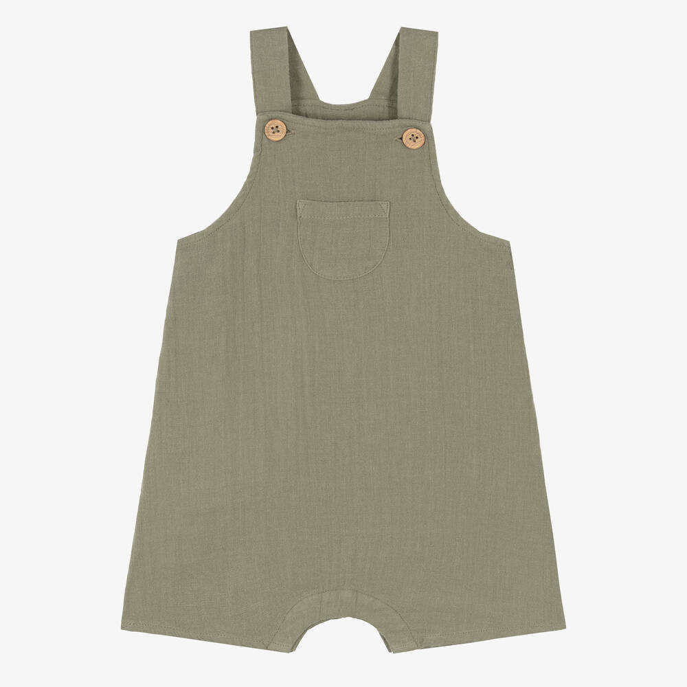 Sweet khaki green dungaree shorts for baby boys and girls by Petit Bateau, made in soft cotton cheesecloth. The shoulder straps fasten with classic wooden buttons on the front and there are easy-fastening poppers between the legs. There is a small chest pocket on the bib front.