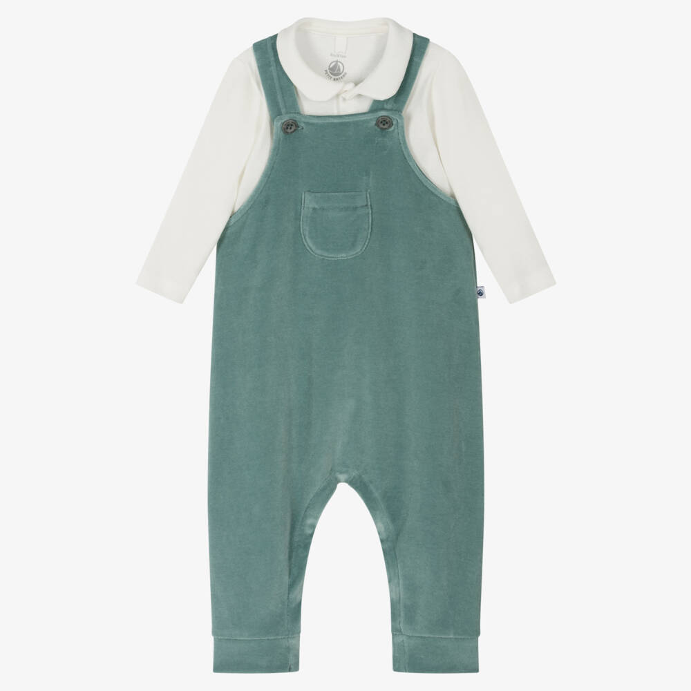 A lovely ivory and green cotton trouser set for baby boys and girls by Petit Bateau. The bodysuit is made in comfortable jersey, with a sweet Peter Pan collar and easy fastening poppers. The dungarees are made in cosy velour, with button fastening straps and popper fastenings between the legs.