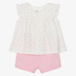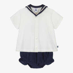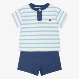 Teal green shorts set for baby boys and girls by Petit Bateau, made with organic cotton. This three-piece outfit includes a gently ribbed cardigan with easy popper fastenings. This pairs nicely with the matching shorts. To complete the look, a soft jersey tee is patterned with stripes and printed with a cute lemon motif on the chest.