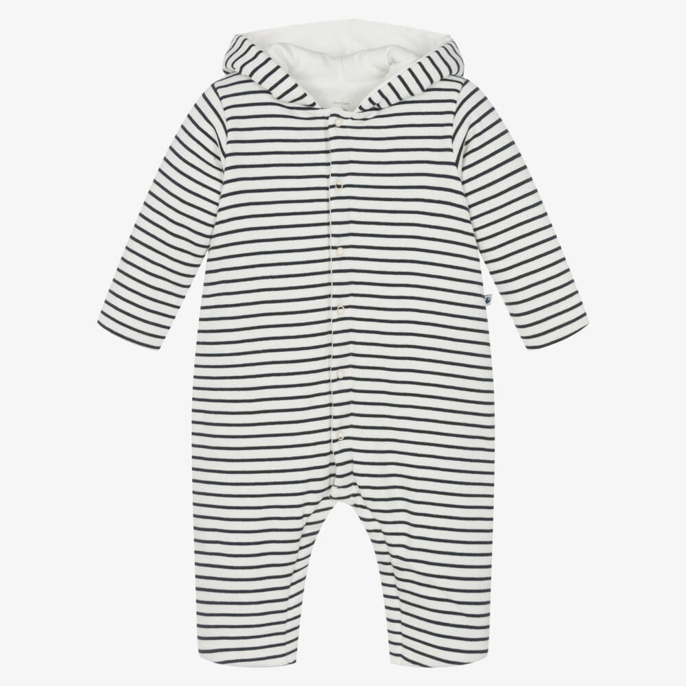 Ivory and navy blue organic cotton pramsuit for baby boys and girls by Petit Bateau, in their classic Breton stripe. Made in soft and comfortable jersey, it is lightly padded for warmth and comes with a cosy hood. For easy dressing, there are popper fastenings on the front and between the legs.