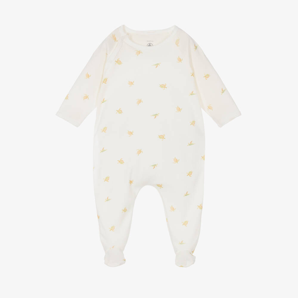 Ivory babygrow for boys and girls by Petit Bateau, made in organic cotton jersey for softness against the skin. With cosy enclosed feet, this sweet babysuit is printed with green and orange turtles. It has a discreet logo print on one sleeve and poppers on one side of the body to make dressing and changing easier.