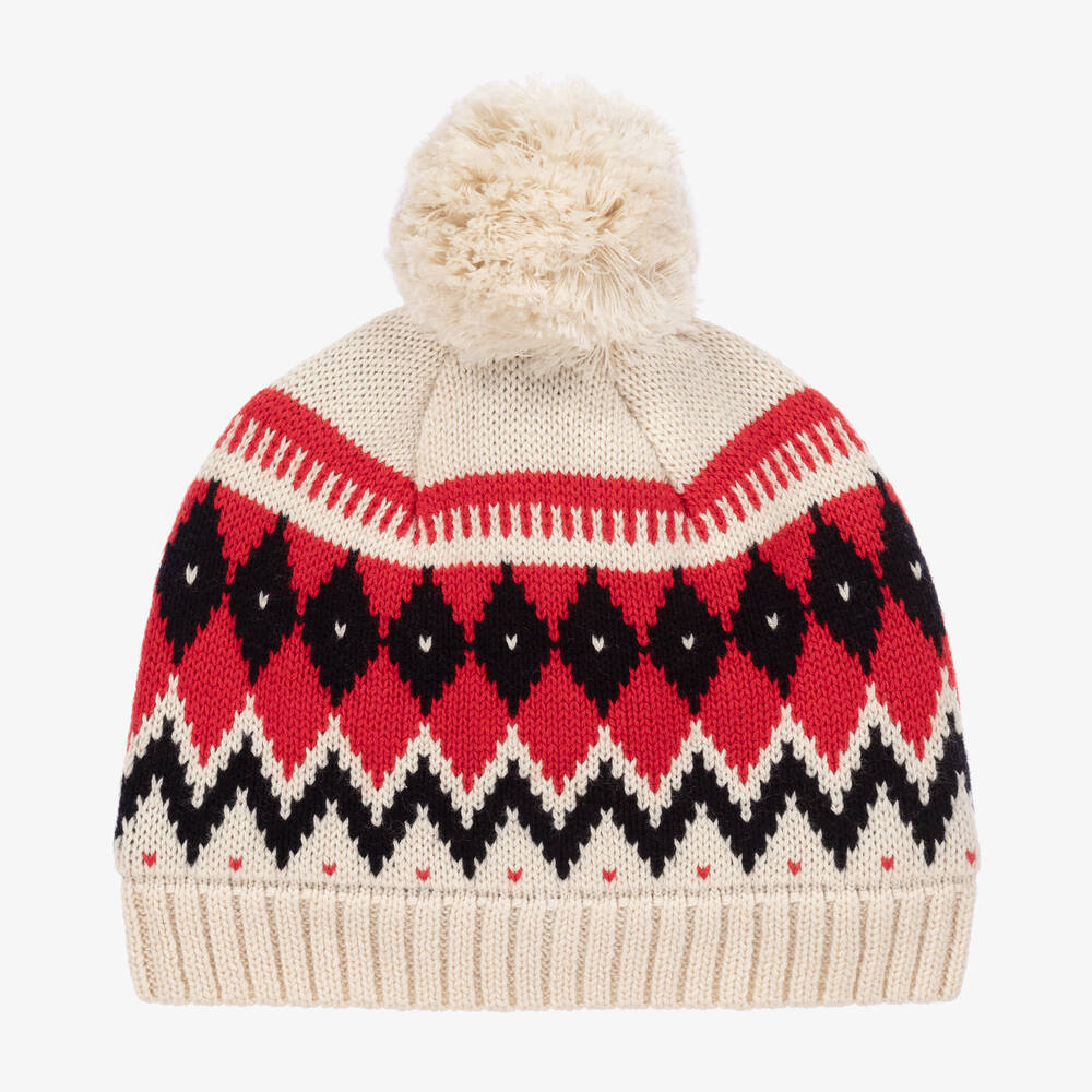 Ivory pom-pom hat for boys and girls by French brand Petit Bateau, with a charming red and navy blue Fair Isle design. Ideal for those colder days, it is knitted in a soft blend of wool and cotton, with a fleecy inside for additional warmth.