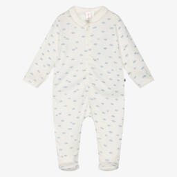 Super cute white cotton shortie gift set for baby boys and girls by Petit Bateau, patterned with sweet red hearts. Made in soft, comfortable jersey, the shortie has a poplin collar with red heart embroidery and a blue logo printed on the chest. It comes with two pairs of cosy socks with fleecy insides and a cute bunny doudou with long ears and knotted corners.