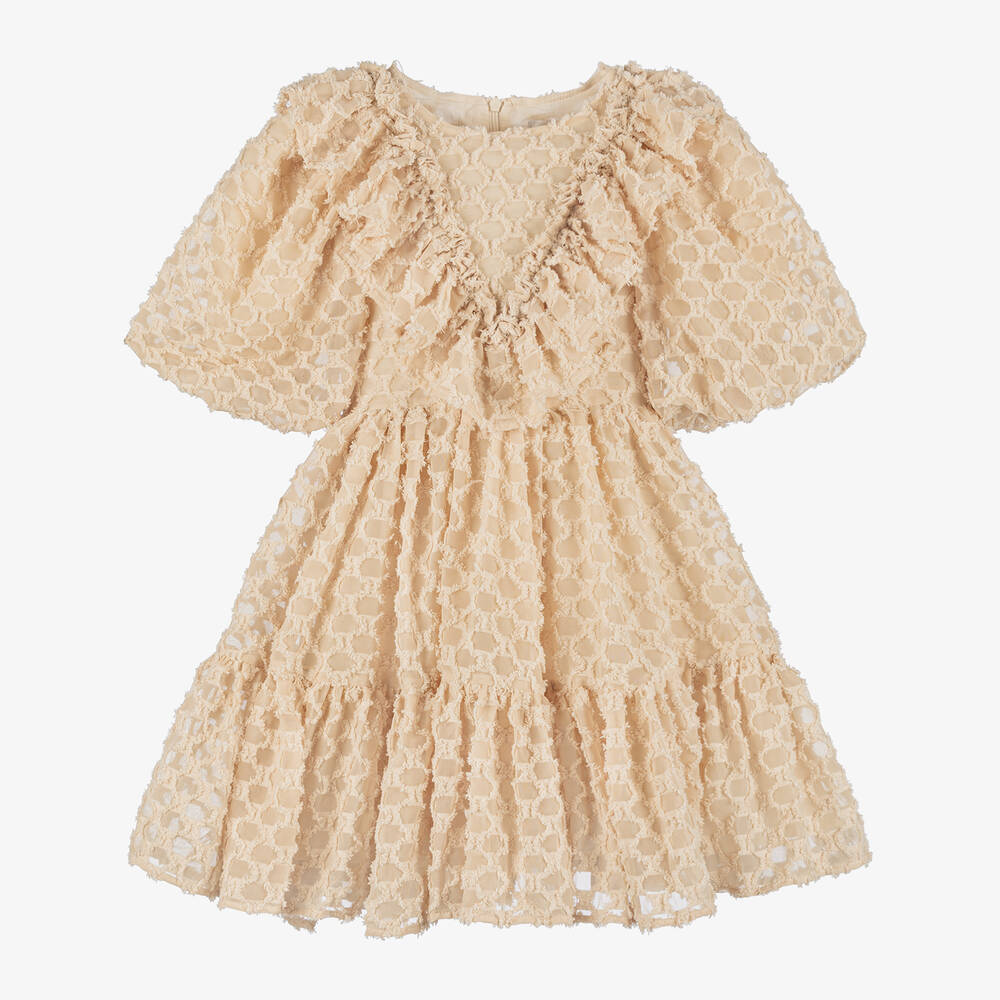 In a lovely shade of blush ivory, this pretty dress for girls by Australian brand Petite Amalie is made in sheer organza with a textured pattern. A timeless style, it has a rounded neckline, full skirt and frilled hem. The puffed sleeves have elasticated cuffs that sit just above the elbow creating a voluminous look, and the bodice is trimmed with a gorgeous ruffle. It is fully lined in soft cotton for comfort and fastens neatly on the back with a concealed zip.
