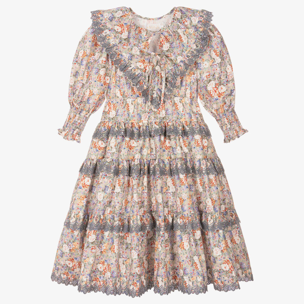 Traditional and timeless, a cotton dress for older girls by Petite Amalie, beautifully patterned with a multicoloured floral design. Made from soft poplin, this ankle length dress has pretty tie fastenings on the neckline, and three-quarter length puffed sleeves with stretchy shirred cuffs. The V-shaped ruffle across the chest and tiered frills are embroidered with delicate grey scallops, and the elasticated waist ensures a comfortable fit.