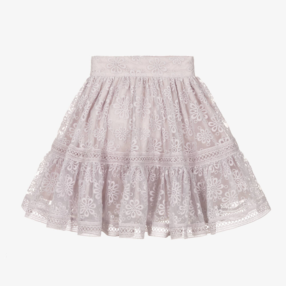 Exclusive to Childrensalon, a lilac purple skirt for girls by Australian brand Petite Amalie, made from beautifully embroidered lightweight organza. Fully lined for comfort in soft cotton voile, this full skirt has pretty lace trims on the hem adding a classic, timeless feel. It fastens neatly on the back with a concealed zip and has an adjustable waistband to ensure a comfortable fit.