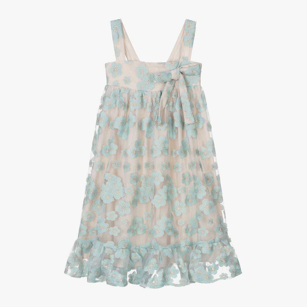 Beautiful turquoise blue dress for girls by Petite Amalie, made in the finest sheer tulle with an embroidered blue floral pattern. This voluminous, sleeveless style has a simple bodice, with a statement bow added for a feminine touch. Lined with ivory cotton for contrast and comfort, it has a floaty, feminine silhouette and fastens discreetly with a concealed zip on the back and buttons on the straps.