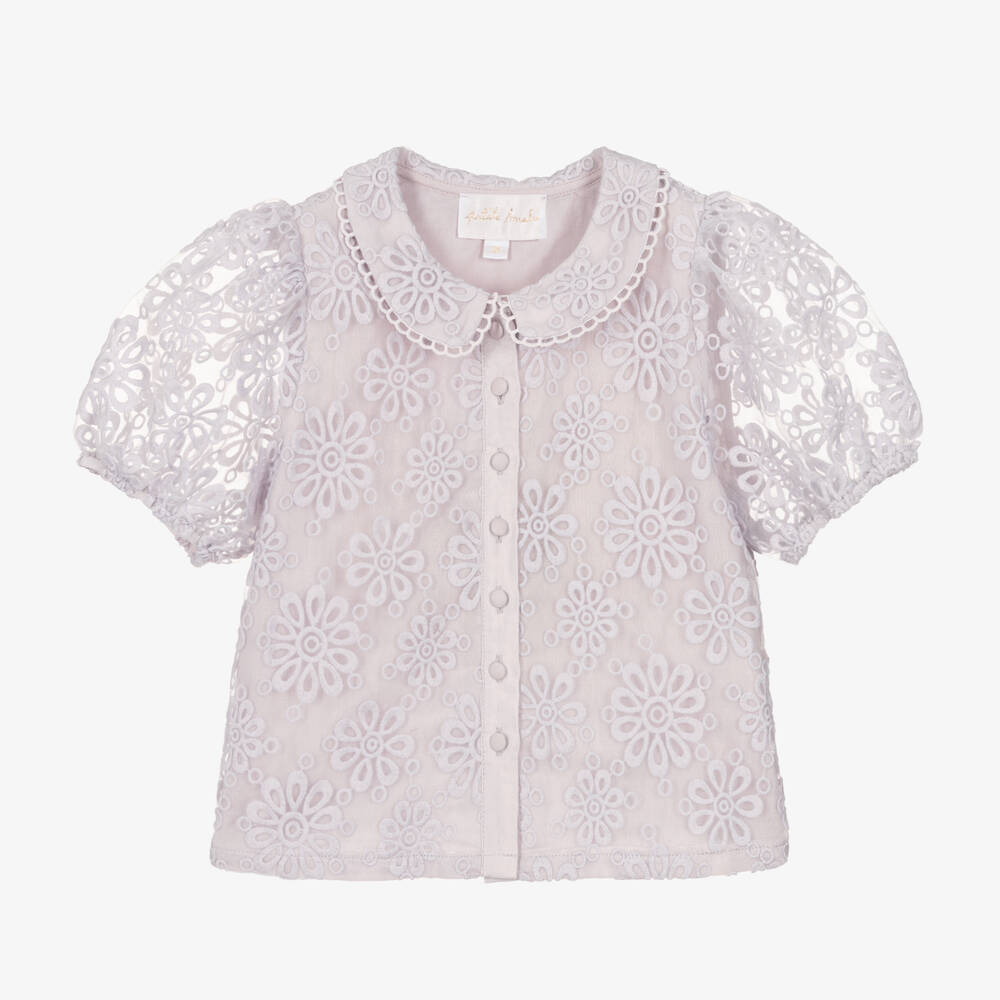 Lilac purple, short-sleeved blouse for teen girls by Australian brand Petite Amalie, made from sheer, lightweight organza. Beautifully embroidered with flowers, it has a round collar and fabric-covered buttons on the front. The short puff sleeves are elasticated on the cuffs for extra volume and the body is lined in lightweight cotton for comfort.