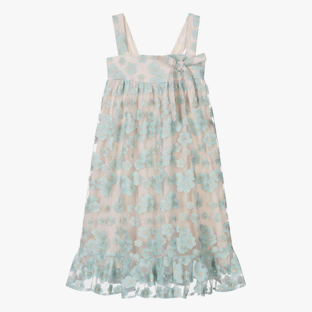 Teen Girls Turquoise Blue Embroidered Tulle Dress