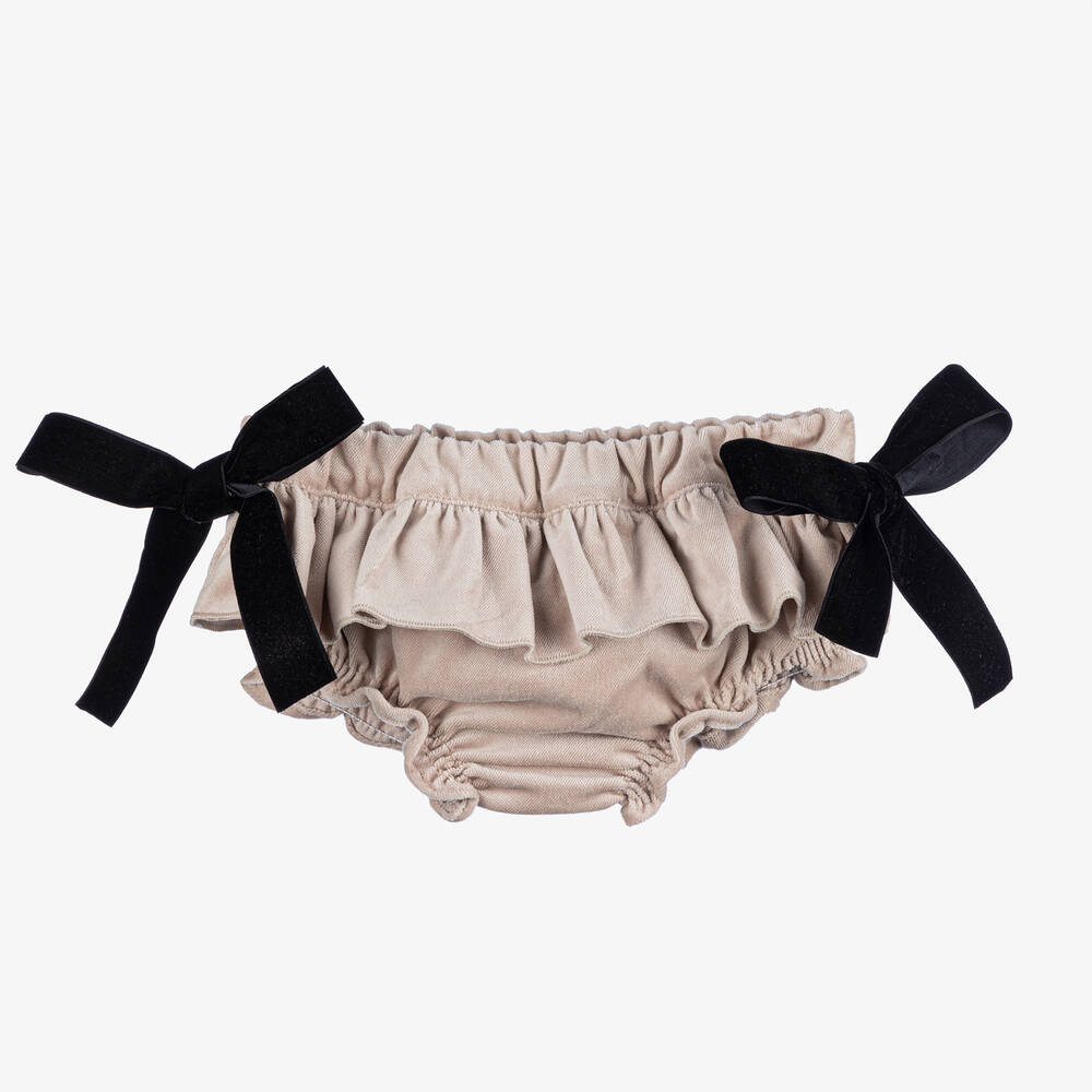 Pretty beige bloomer shorts for baby girls by Phi Clothing, made in soft cotton velvet. Decorated with beautiful velvet bows on the sides, they have elasticated trims for comfort on little one's tummy and legs.