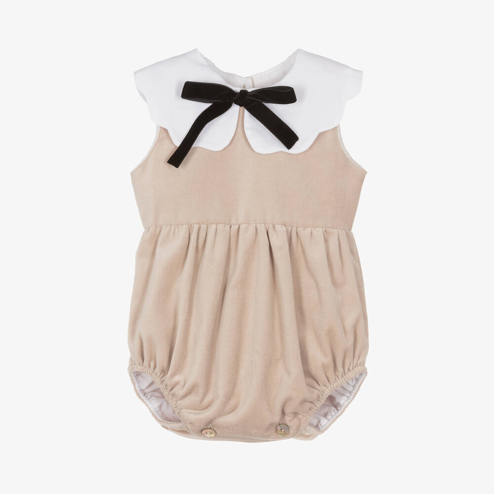 Lovely beige shortie for baby girls by Phi Clothing, made in soft, lightweight velvet. This pretty shortie has a wide white collar with a scalloped edge and a black velvet bow trim on the front. Fully lined in soft cotton for comfort, it fastens on the back and between the legs with mother-of-pearl buttons.